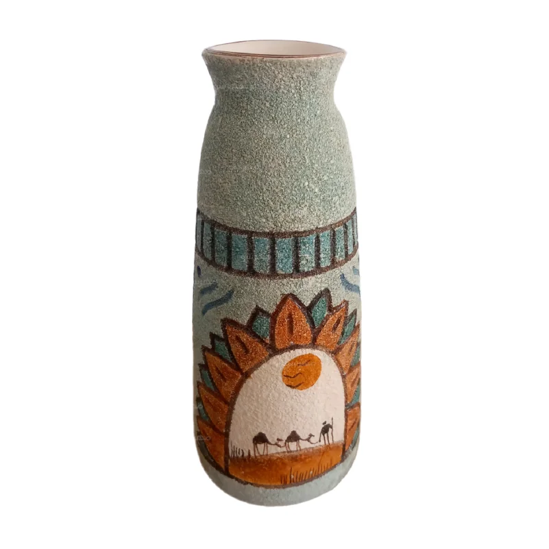 گلدان رعنا طرح کویر برگرفته از هنر دست و ذهن هنرمندان برجسته شهر جهانی سفال میباشد و با جلوه ای از طبیعت و فرهنگ اصیل ایرانی، حس و حالی گرم را برای شما به ارمغان می آورد. در طراحی و ساخت این اثر از هیچگونه شابلون یا دستگاهی استفاده نشده است تا همواره اصالت و هنر در آن حفظ گردد. در نتیجه، هر اثر در جزئیات خود، منحصربفرد و غیر تکراری میباشد. ترکیبی از سفال تقویت شده و طیف وسیعی از لعاب ها در دمای نزدیک به 1000درجه پخته می شوند تا رنگ و طرح های این اثر در برابر عوامل مختلف از جمله آب مقاوم باشد.